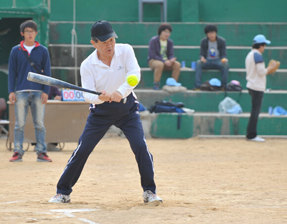 이본수 총장 "홈런 예감" 8일 오후 인하대 야구장에서 열린 '교무위원·총학생회 소프트볼 게임'에서 이본수 인하대 총장이 홈런을 기대하며 힘껏 스윙하고 있다. 이 경기에서 이 총장이 속한 교무위원팀이 학생들로 구성된 총학생회팀을 11대 6으로 이겼다.