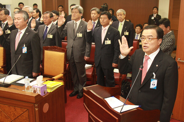 '증인 선서하는 김승택 충북대 총장' 김승택 충북대 총장(사진 맨 오른쪽)이 12일 충북대에서 열린 충북대·충남대에 대한 국회 교육과학기술위원회 국정감사에 앞서 증인 선서를 하고 있다.