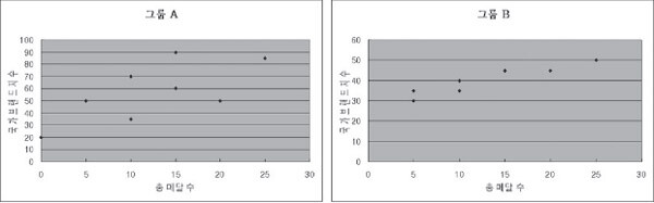 위의 좌표평면에 표시된 자료를 보면, 그룹 B가 그룹 A보다 직선주위에 자료가 더 몰려 있다는 것을 볼 수 있다. 이는 그룹 B가 총 메달 수와 국가 브랜드 지수 간에 더 강한 상관관계를 가지고 있음을 보여준다고 할 수 있다.