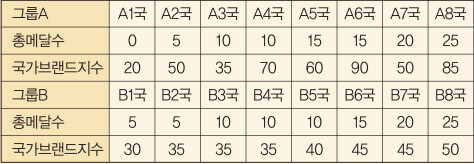 [3-2] 아래의 표는 16개국을 어떤 기준에 의하여 그룹 A와 그룹 B로 8개국씩 나누어 총 메달 수와 국가 브랜드 지수를 정리한 것이다. 이 자료에 근거하여 총 메달 수와 국가 브랜드 지수 사이의 상관관계가 어느 그룹에서 더 강하게 나타나는지를 설명하시오. [답안지 10줄 이내로 자유롭게 쓸 것, 15점]