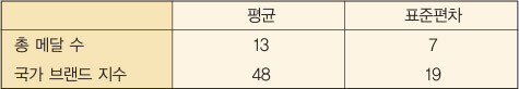 [문제 3] 올림픽은 세계인의 스포츠 축제를 넘어, 세계시장에서 한 국가의 글로벌 브랜드 가치를 제고하는 무대로 자리 잡고 있다. 올림픽의 경제적 가치와 효과를 분석하기 위하여, 세계 주요 16개국이 획득한 총 메달 수와 해당 국가의 국가 브랜드 지수를 조사했다. 이 자료에 대한 요약값들은 다음과 같다고 한다. (단, 요약값들은 소수점 첫째 자리에서 반올림하였음)
