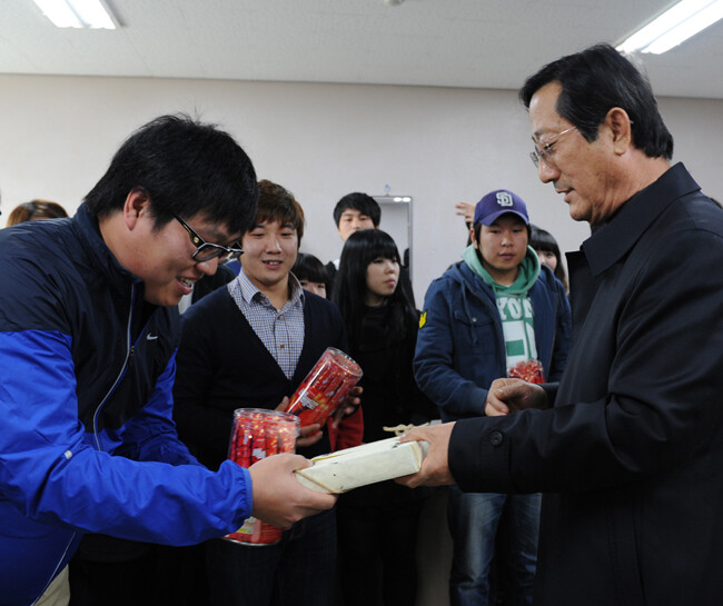 "총장님의 특별한 빼빼로 선물" 11일 빼빼로 데이를 맞아 소병욱 대구가톨릭대 총장이 학생들에게 깜짝 빼빼로 선물을 했다. 소 총장은 이날 오후 총학생회 사무실을 방문, 50여 명의 학생들에게 빼빼로와 사랑의 메시지를 전했다. 깜짝 선물을 받은 학생들은 소 총장에게 감사의 뜻을 전달, 소 총장과 학생들 간 훈훈한 정이 오갔다. 사진은 소 총장이 한 학생에게 빼빼로를 선물하는 모습.