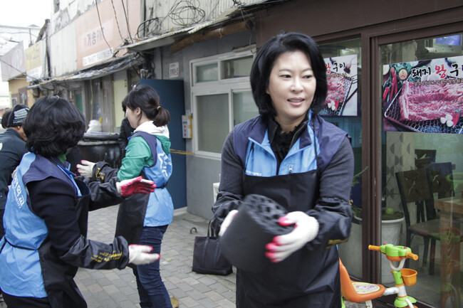쪽방촌 주민들에게 연탄을 배달하는 한영실 숙명여대 총장 = 한영실 숙명여대 총장이 24일 오후 쪽방촌이 몰려있는 서울 한강로1가 일대에서 연탄을 나르고 있는 모습. 한 총장과 숙명여대 구성원들은 이날 오후 학교에 집결해 ‘숙명, 사랑의 연탄 나눔’ 발대식을 갖고 조별로 나눠 용산구내 저소득층 가정 400여 세대에 총 1만5,000여 장의 연탄을 배달했다. 이 연탄은 숙명여대가 지난해와 올해 개최한 ‘숙명 사랑듬뿍 바자회’ 수익금으로 구입했다.