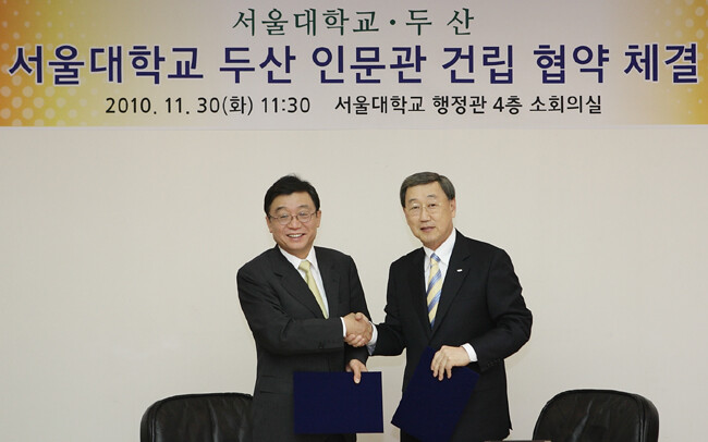 서울대는 30일 "두산(회장 박용현)과 교내 행정관 4층 소회의실에서 '서울대 두산 인문관' 건립을 위한 협약 체결식을 가졌다"고 밝혔다.