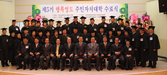 행복영도 주민자치대학은 한국해양대 평생교육원이 영도구청과 더불어 2008년 5월 개설했다. 지방자치시대에 지역발전의 원동력인 주민의 자치의식 향상 등이 목적. 영도구 각 동 주민자치위원 등을 대상으로 매년 1,2회씩 8주간의 과정으로 실시되며 이번 5기 과정은 지난 10월 12일부터 11월 30일까지 매주 화요일마다 운영됐다. 이번에 수료증을 받은 인원은 총 37명이다.