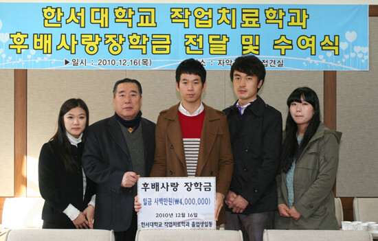 한서대(총장 함기선)는 작업치료학과 동문들이 16일 후배들을 위해 4백만원을 모아 함기선 총장에게 전달했다고 밝혔다.