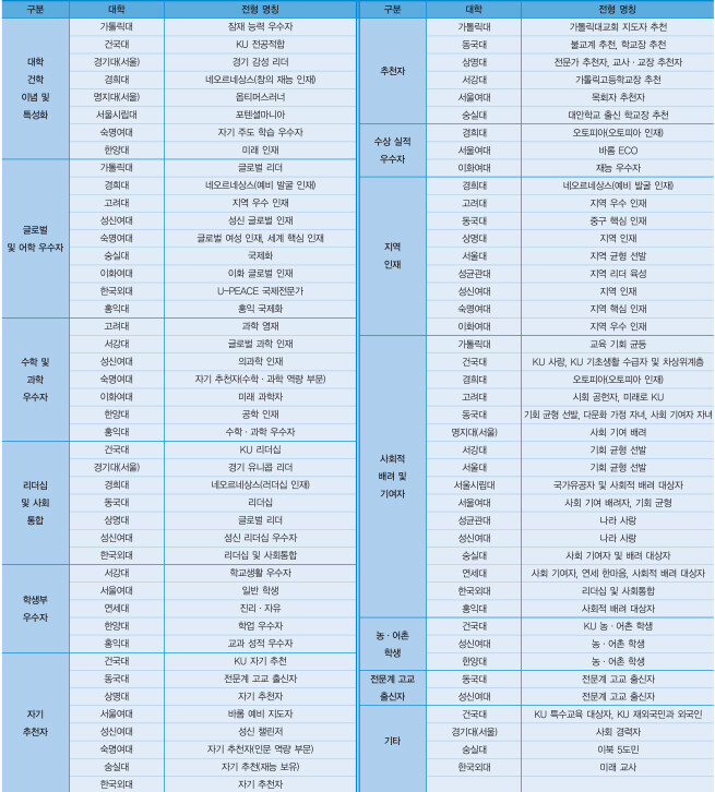 셋째, 입학사정관 전형의 유형을 세부 전형으로 구분하여 분류했으면 한다. 현재 시행되고 입학사정관 전형을 보면 일반 전형뿐만 아니라 특기자 특별 전형, 대학별 독자적 기준에 의한 특별 전형, 정원외 특별 전형인 농·어촌 학생, 전문계 고교 출신자, 기회 균형 선발 등 모든 전형을 아우르고 있는데, 이를 현행 ‘대학별 독자적 기준에 의한 특별 전형’처럼 지원 자격을 기준으로 전형을 유형화하고 모집요강에도 꼭 명시했으면 한다.
