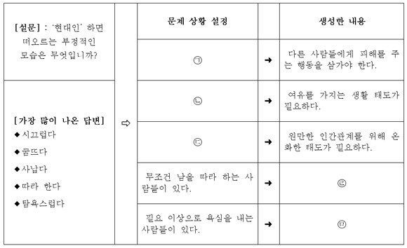 1. 설문 조사한 결과를 바탕으로 '바람직한 삶의 자세'라는 제목으로 글을 쓰고자 할 때, 1. ㉠~㉤에 들어갈 내용으로 적절하지 않은 것은? (2점)