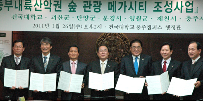 '중부내륙산악권 숲 관광 메가시티 조성사업'은 건국대 충주캠퍼스 지역개발디자인연구센터가 지난해 대통령 직속 지역발전위원회의 연계협력사업에 지원해 선정된 사업이다. 사업에는 향후 3년 간 총 84억 원(국비50%, 시·군비50%)이 투입되며 6개 시·군의 산림자원을 활용, 각각에 콘텐츠(테마)를 부여해 관광사업과 연계시키게 된다.