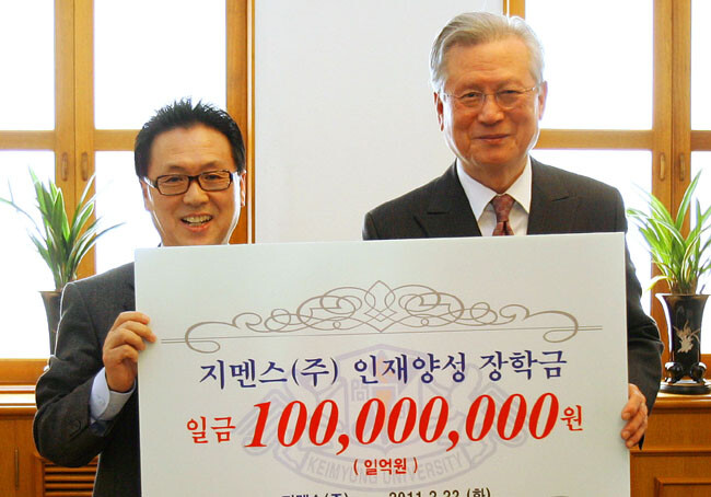이와 관련 계명대와 지멘스(주)는 지난 22일 계명대 본관에서 지멘스 헬스케어 코리아 박현구 대표(사진 왼쪽)와 계명대 신일희 총장이 참석한 가운데 '지멘스(주) 인재양성 장학금 전달식'을 가졌다. 이번 지멘스(주)의 특별 장학금 출연은 계명대와의 산학협력관계가 지속적으로 유지돼 온 것이 계기가 됐다.