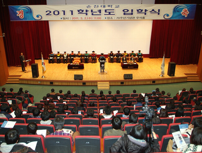 순천대(총장 임상규)는 2011학년도 입학식을 2일 교내 70주년기념관 우석홀에서 개최했다. 이날 입학식을 통해 학부생 2104명, 대학원 석사과정 289명, 박사과정 49명 등 총 2443명이 새 출발을 시작했다.