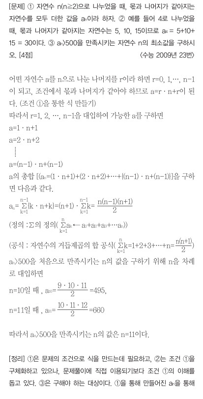 [정리] ①은 문제의 조건으로 식을 만드는데 필요하고, ②는 조건 ①을 구체화하고 있으나, 문제풀이에 직접 이용되기보다 조건 ①의 이해를 돕고 있다. ③은 구해야 하는 대상이다. ①을 통해 만들어진 an을 통해 최종적으로 답을 구하는 데 필요하다.