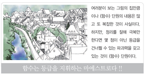 수학(하)를 배울 때, “그래 넌 수학이 안 되는 아이야.”라고 확실하게 종결지어 주는 단원이 바로 《함수》 단원이다. 우선 그 ‘분량’에 압도되고, 그 ‘내용’마저도 호락호락하지 않다. 그런데 그 함수가 나중에는 더 큰 함정을 파놓고 기다리고 있을 줄은 그 당시 잘 알지를 못한다.