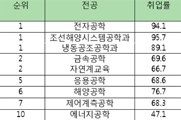 국내 유일 조선해양시스템공학과 95.7%, 냉동공조학과 89.1%