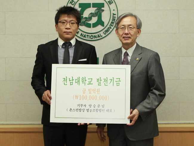 주인공은 양승준 촌스런밥상 영농조합법인 대표.(32·사진 왼쪽) 양 대표는 17일 직원들과 함께 모교인 전남대를 찾아 발전기금 1억 원을 전달했다.