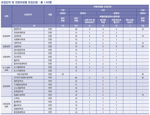 모집인원이 643명으로 가장 많은 정시 나군 일반전형 인문·자연계열에서는 모집 인원의 70%는 수능 100%로 우선 선발하고, 나머지 30%는 수능 70%, 학생부 30%로 뽑는다. 나군에서는 입학사정관전형도 치러진다. 사회기여 및 배려대상자 등 4개 전형에서 서류(수능, 학생부 포함) 40%, 심층면접 60%를 적용한다. 수능 최저학력 기준은 인문계열의 경우 언, 수, 외, 탐 중에서 3개 이상 3등급 이내, 자연계열의 경우는 2개 이상 3등급 이내다.