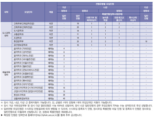 가군에서는 일반전형을 통해 자유전공학부 33명, 예체능계열 136명을 선발한다. 자유전공학부는 수능 100%를 적용하고 예체능계열의 경우는 학과별로 1단계에서 수능 성적만으로 4~6배수를 가린 뒤 2단계에서 수능, 학생부, 실기고사를 합산해 최종 합격자를 뽑는다. 단 음악학과의 경우는 단계별 전형 없이 수능 20%, 학생부20%, 실기 60%를 적용한다. 다군 일반전형은 인문·자연계열과 일부 학과, 자유전공학부에서 120명을 수능 100%로 선발한다.
