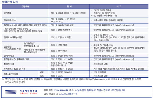 서울시립대학교는 2012학년도 정시모집에서 전년도와 마찬가지로 가군, 나군, 다군으로 분할모집을 유지한다. 가군에는 자유전공학부와 예체능계열 학과를, 나군에서는 인문, 자연계열 일반전형 및 특별전형을, 다군에서는 인문계열 및 자연계열 일부 학과를 모집한다. 다군의 경우 전년도와 달리 자연계열 일부 학과도 선발한다. 또한 자연계열의 경우 탐구영역 반영비율을 전년도 15%에서 20%로 확대했다.