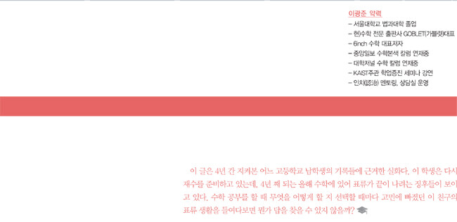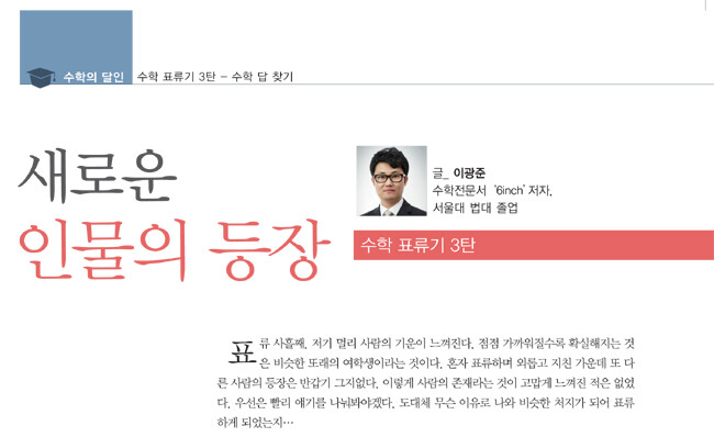 그런데 점점 가까워질수록 느껴지는 이 기운은 뭘까? 분명히 뭔가 다르다는 느낌이 강하게 든다. 드디어 서로의 모습을 똑바로 쳐다볼 수 있는 거리가 되었을 때 너무나도 확실한 느낌이 들었다. 이 여학생은 나처럼 수학에서 표류하는 인생이 아니라는 사실. 눈에는 총기가 넘쳐나고 온몸은 자신감으로 똘똘 뭉쳐진 것과 같은 느낌이 나는 이 여학생. 나에게 또 다른 좌절을 맛보게 할 모양인가?