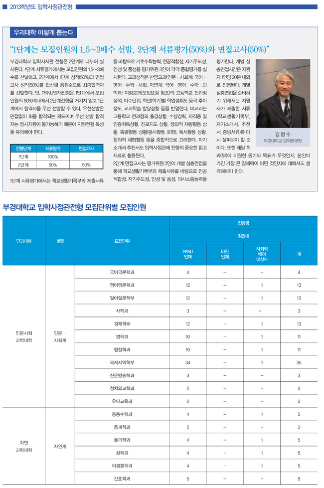 부경대학교는 2013 학년도 입학전형에서 입학사정관제전형을 통해 365 명의 다양한 잠재력을 가진 학생들을 선발한다 . 입학사정관전형은 PKNU인재, 마린인재, 사회적배려대상자 전형으로 나눠 실시되며 정원 내 모집인원으로만 선발한다. 부경대학교 입학사정관제 전형은 평가의 공정성을 확보하기 위해 입학사정관전형 자체 서류종합평가 시스템을 개발해 활용하고 학부모 모니터링단을 운영하는 등 입학사정관 전형의 공정성과 신뢰성 확보에 최선의 노력을 기울이고 있다 . 또한 고교생의 학과 ( 부 ) 전공 이해도를 높이고 올바른 진로 선택에 도움을 주고자 「토요진로상담 ‘교수님께 물어봐!’」 등 다양한 고교-연계 프로그램을 운영한다 .