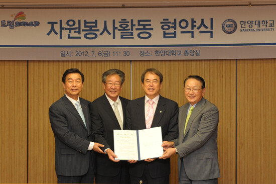 한양대(총장 임덕호)와 한양대의 동문 사회봉사단인 ‘함께한대(단장 구자준 LIG손해보험 회장)’는 6일 서울캠퍼스에서 어린이재단(회장 이제훈)의 문화예술사업인 ‘초록우산 드림오케스트라 공동 후원’ 업무 협약을 체결했다.