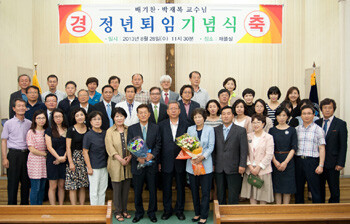 도정기 총장 외 대학 교직원과 학생들이 대거 참석한 가운데 열린 이날 퇴임식은 공로패 및 기념품 증정을 시작으로 꽃다발 증정, 축사, 정년 회교사 순으로 진행됐다.