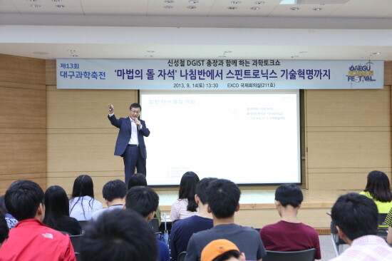 대구·경북 지역 청소년 및 일반인 500여 명이 참석한 이번 토크쇼는 ‘마법의 돌 자석 : 나침반에서 스핀트로닉스 기술혁명까지’라는 주제로 자석의 원리를 응용한 최첨단 과학기술에 대해 흥미로운 강연으로 펼쳐졌다.