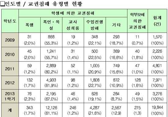 국회 교육문화체육관광위원회 소속 민주당 윤관석 국회의원(인천 남동을)이 교육부 국정감사 자료를 통해 밝힌 지난 4년간 초·중·고등학교의 교권침해 사례는 총 1만 6568건으로 2009년 1570건, 2010년 2226건, 2011년 4801건, 2012년 7971건으로 매년 증가했다. 2013년 1학기만 해도 이미 3276건의 교권침해 사례가 발생했다.