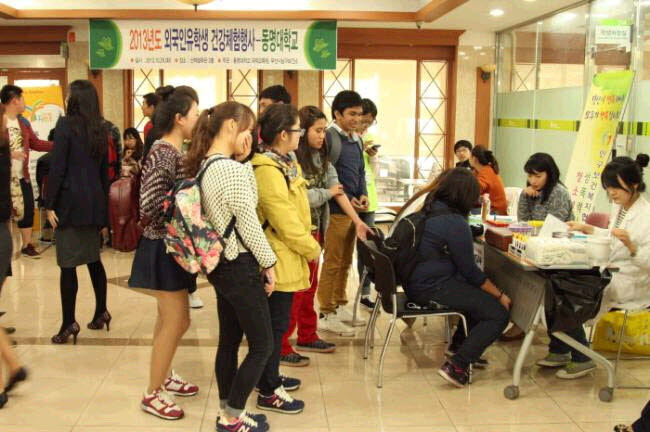 동명대는 지난 29일 산학협력관 2층 로비와 205호, 207호에서 외국인유학생을 대상으로 ▲체성분 및 골밀도 검사 ▲혈압/혈당검사 및 의료상담 ▲흉부X-선 촬영 ▲스트레스검사, 우울 및 자살상담 등 ▲성병, 에이즈검사 및 상담 ▲임신 및 성교육 ▲피부상담 ▲절주상담 ▲운동/영양/금연 상담 9개 프로그램에 대해 필수 검진코스와 선택 검진코스로 나눠 건강검진을 실시했다.