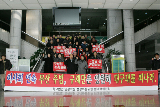 이날 이들은 "교육부가 학원 정상화의 최종 시한으로 제시한 20일까지 정상화를 이루지 못한 현 영광학원 이사들을 즉시 해임하고, 다음달 말까지 책임감 있고 사심없는 임시이사를 파견할 것"을 강력하게 요청했다.