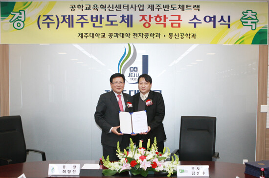 (주)제주반도체는 24일 공과대학 전자공학과 학생 8명과 통신공학과 학생 2명 등 10명에게 총 2000만 원의 장학금을 전달했다. 장학금 수여식은 허향진 총장을 비롯한 대학 관계자와 박성식 대표이사 등이 참석한 가운데 제주대 본관에서 열렸다.