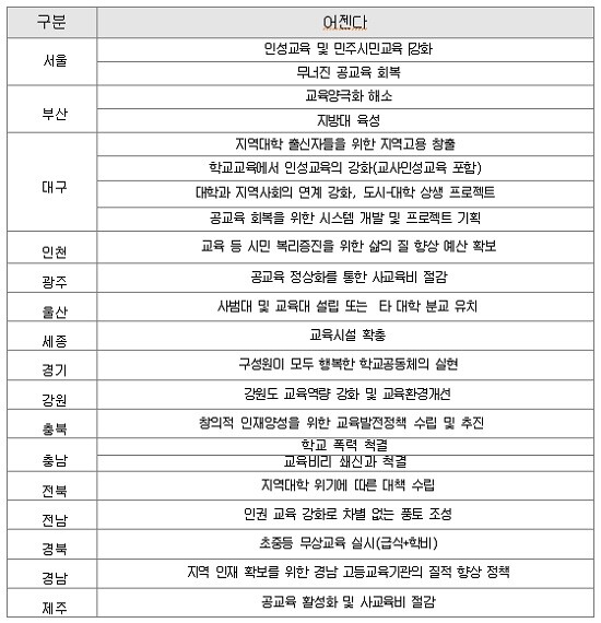 <대학저널>이 선관위가 공개한 각 시·도별 '10대 지역 어젠다' 가운데 교육분야만을 발췌, 분석한 바에 따르면 서울(무너진 공교육 회복), 대구(공교육 회복을 위한 시스템 개발 및 프로젝트 기획), 광주(공교육 정상화를 통한 사교육비 절감), 경기도(구성원이 모두 행복한 학교 공동체 실현), 제주(공교육 활성화 및 사교육비 절감) 등 공교육 정상화와 관련된 어젠다가 가장 많은 시·도에서 포함됐다.