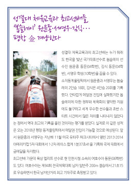 또한 최근 막을 내린 ‘2014 소치동계올림픽’에 출전한 체육교육과 동문들과 재학생의 활약상도 두드러진다. 원윤종·김식(04학번) 동문, 서영우(10학번) 학생이 그 주인공이다. 비록 이들은 메달 획득에는 실패했지만 한국 봅슬레이 역사상 올림픽 최고 성적을 거두며 4년 후 평창동계올림픽의 기대주로 떠올랐다.
