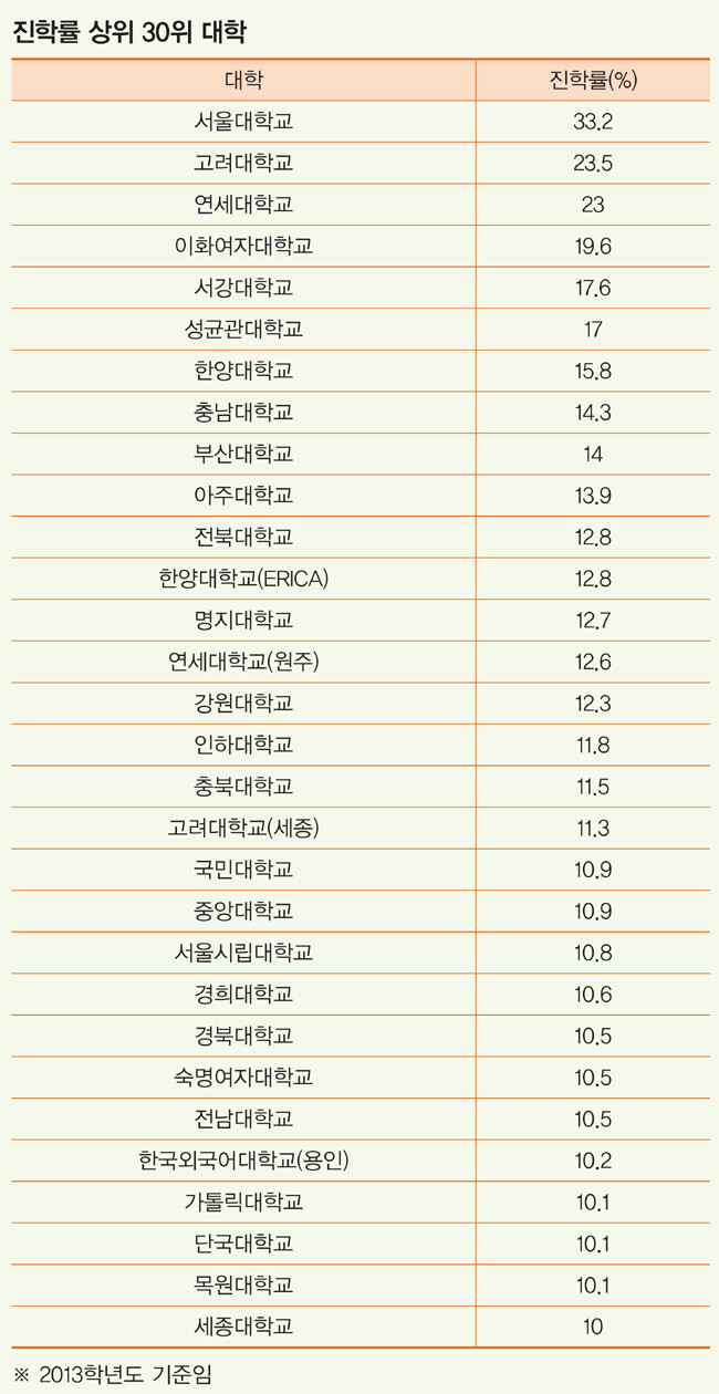 취업률 못지않게 주목받는 지표는 진학률 지표다. KAIST, POSTECH, GIST 등 이공계 특성화 대학과 신학대학의 경우 특성상 진학률이 높은 대학이다. 일반대학에서는 취업이 아닌 학문 분야에 대한 깊은 연구 및 학습을 원하는 학생들의 비율이 높다는 반증이다. 일반 4년제 재학생 5000명 이상 대학을 기준으로 할 경우 서울대 졸업생의 진학률이 33.2%로 가장 높았다. 고려대가 23.5%, 연세대가 23%의 진학률을 보였으며 이어 서강대(17.6%), 성균관대(17%), 한양대(15.8%), 충남대(14.3%), 부산대(14%), 아주대(13.9%) 등이 10위권에 이름을 올렸다. 10위권 안에서는 충남대와 부산대 등 비수도권 2개대학이 명함을 내밀었다.
