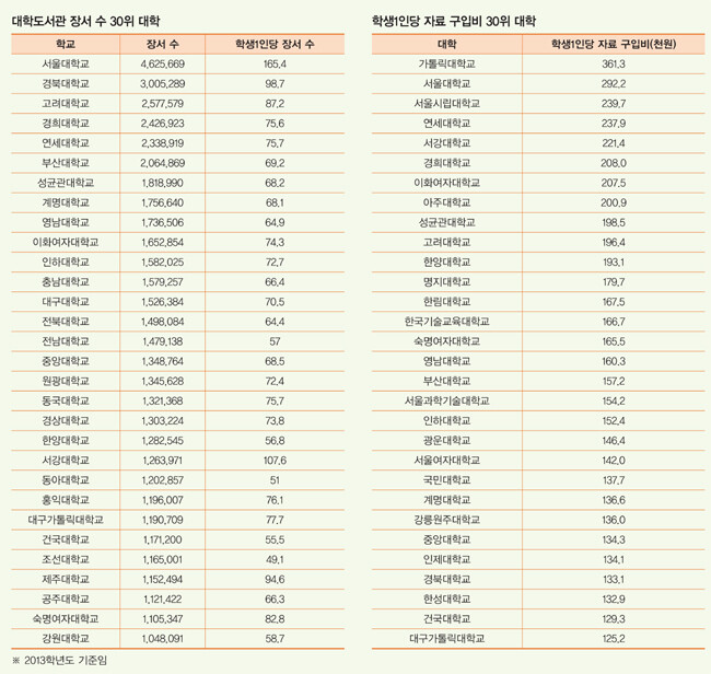 대학 도서관의 장서 수는 학문 경쟁력을 위한 기초 체력과 같은 것이다. 도서관 장서 수는 곧 대학의 교육·연구 여건을 보여주는 중요한 지표다. 국내 대학들의 장서 보유 현황을 살펴보자. 국내 대학도서관 중 장서를 가장 많이 보유하고 있는 대학은 서울대로 국내·외서를 합쳐 총 462만 여권의 책을 보유고 있다. 다음으로 경북대(300만 여권), 경희대(242만 여권), 연세대(233만 여권), 부산대(206만 여권), 성균관대(181만 여권), 계명대 (175만 여권), 영남대(173만 여권), 이화여대(165만 여권), 고려대(127만 여권) 등이 10위권에 들었다. 이들 대학들은 오랜 전통을 가진 대규모 대학들이라는 특징을 가지고 있다.