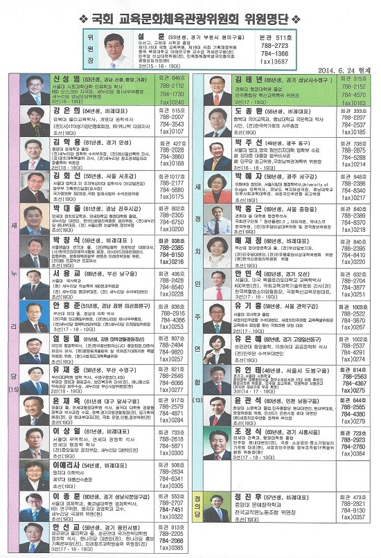또한 새누리당에서는 강은희, 김학용, 김회선, 박대출, 박창식, 서용교, 안홍준, 염동열, 유재중, 윤재옥, 이상일, 이에리사, 이종훈, 한선교 의원이 교문위 위원으로 참여하고 새정치민주연합에서는 도종환, 박주선, 박혜자, 박홍근, 배재정, 안민석, 유기홍, 유은혜, 유인태, 윤관석, 조정식 의원이 교문위 위원으로 참여한다. 정의당에서는 정진후 의원이 전반기에 이어 하반기에도 교문위 위원으로 활동한다.