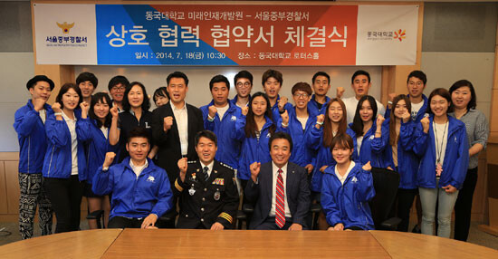 윤성이 동국대 미래인재개발원장과 윤소식 서울 중부경찰서장은 18일 10시 30분 동국대 본관 로터스홀에서 업무협약 체결식을 갖고 노인, 저소득층 및 결손가정 어린이 등 중구지역 소외계층을 지원하기 위한 상호협력을 적극 추진하기로 했다.