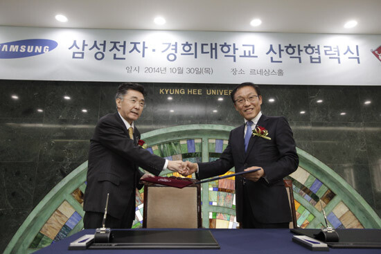 30일 경희대 국제캠퍼스 진행된 이번 협약식을 통해 양 기관은 ▲산학협동 공동연구 프로젝트 개발 ▲삼성전자주식회사 DS부문 소속 우수 임직원의 경희대 겸임교원 위촉 ▲경희대 우수인력 양성을 위한 지원 ▲삼성전자주식회사 DS(Device Solution)부문 유휴재원 내 실습기자재 및 장비 기증, 지원 ▲삼성전자주식회사 DS부문 임직원 재교육을 위한 경희대 평생교육원 시설, 강사 및 프로그램의 이용 및 운영 ▲양 기관 문화교류를 통한 우호적 협력관계 구축 등에 합의했다.