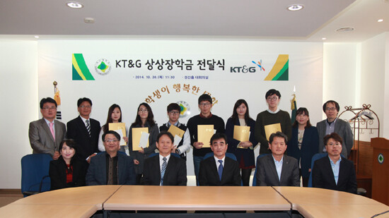 KT&G에서는 대학의 역량강화와 우수인재 육성을 위해 대구대에 1300만원의 장학금을 기탁했다. 이날 대구대는 상상장학생 10명을 선발, 장학증서와 함께 각 100만 원을 전달했다.