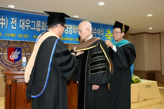 원광대는 기업인으로서 공과에 대해 다양한 의견이 있지만, 우리나라 경제발전과 대학 발전에 기여한 공로를 인정하고, 학교와의 선린관계를 고려해 이날 김우중 전 회장에게 명예 경영학박사 학위를 수여했다.