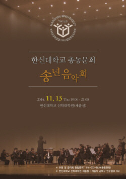 한신대학교(총장 채수일) 총동문회(회장 한성수)가 한해를 마무리하고 동문들의 교류와 화합을 다지기 위한 ‘2014 한신대학교 총동문회 송년의 밤’ 행사를 오는 11월 13일(목) 오후 7시 한신대학교 서울캠퍼스 신학대학원 채플실에서 개최한다.