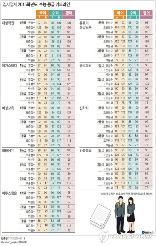 대성학원와 비타에듀가 영어 1등급 커트라인을 100점으로 예상했고, 메가스터디, 비상교육, 이투스청솔, 유웨이중앙교육, 종로학원, 하늘교육 등 7개사는 98점, 진학사는 97점으로 추정했다.