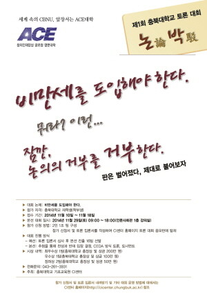 충북대 ACE사업단이 주최하고 기초교육원 CI센터에서 주관하는 이번 행사는 ‘비만세(fat tax)를 도입해야 한다’는 논제를 가지고 지난 11월 10일부터 18일까지 학생들의 참가 신청서를 받은 결과 총 72팀이 참가를 신청했다. 예심을 거쳐 본선 진출팀 16팀을 선정해 이날 본선 대회를 갖는 것. 본선은 CEDA(Cross Examination Debate Association)의 토론 방식의 토너먼트 형식으로 29일 열린다. 최우수상 1팀에게는 총장상 및 상금 200만 원이 수여된다.