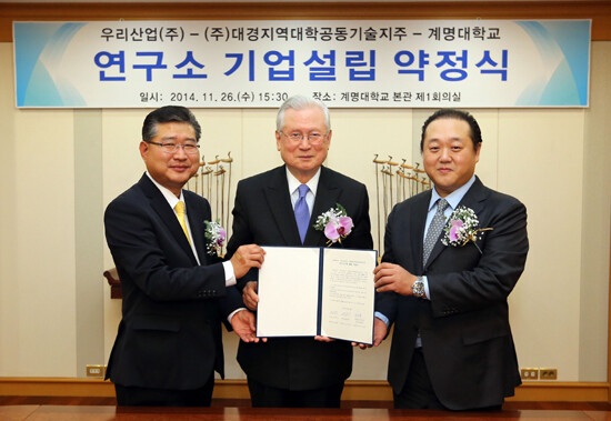이날 체결식에는 계명대 신일희 총장, 우리산업(주) 김정우 대표이사, ㈜대경지역대학공동기술지주 전대엽 대표이사 등 주요 관계자들이 참석했다.