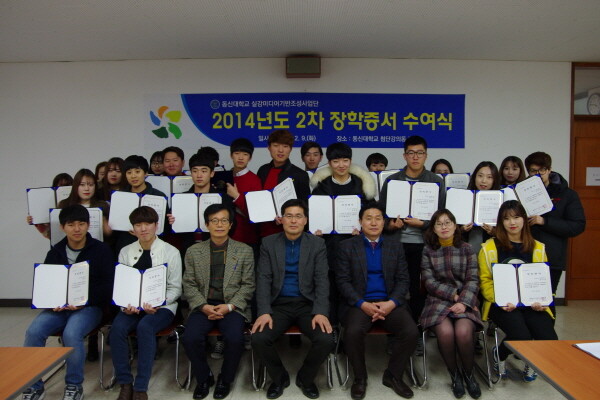 동신대학교(총장 김필식) 실감미디어기반조성사업단(단장 허기택 디지털콘텐츠학과 교수)은 최근 동신대 첨단강의동에서 2014학년도 2차 장학증서 수여식을 갖고 디지털콘텐츠학과 재학생 53명에게 총 9600여만 원의 장학금을 전달했다.