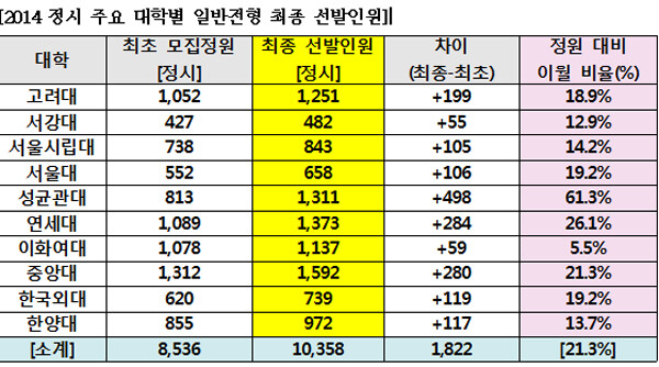 또한 성균관대는 최초 903명 선발에서 257명이 이월(정원 대비 28.5%)됨에 따라 최종 1160명을 선발하고 한양대는 최초 모집인원에 비해 6명 증가한 802명을 선발한다.