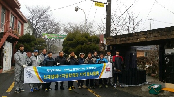 경상대학교(총장 권순기) 융합과학기술대학원 한국남동발전 계약학과 교수와 학생 15명이 20일 문산읍 강막달 씨 등 5가구에 연탄 1000장을 직접 배달하는 ‘사랑의 연탄 나눔 봉사활동’을 실시했다.