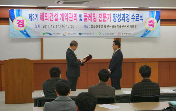 제 3기 해외건설 계약관리 및 클레임 전문가 양성과정 수료식이 17일 충북대학교(총장 윤여표) 학연산공동기술연구원에서 열렸다.