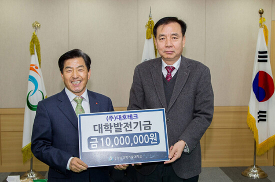경남과학기술대학교(총장 권진택)가 21일 (주)대호테크 정영화 대표로부터 발전기금 1000만 원을 전달받았다.