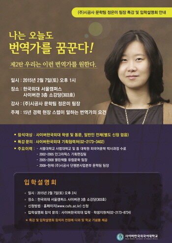 사이버한국외대(www.cufs.ac.kr, 총장 김인철)가 7일 오후 1시 한국외대 서울캠퍼스 사이버관 소강당에서 ㈜시공사 문학팀 정은미 팀장을 초청해 번역가 릴레이 특강을 이어간다. <우리는 이런 번역가를 원한다>라는 주제로 펼쳐질 두 번째 번역가 특강은 15년 경력의 현장 스텝이 말하는 번역가의 요건에 대해 담을 예정이다.